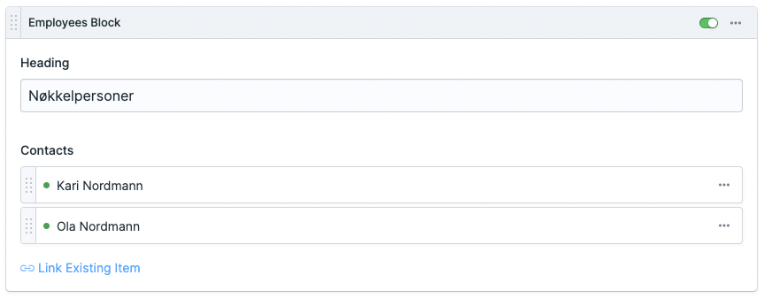Denne blokken kan brukes til å vise kontaktpersoner / ansatte i flertall (i motsetning til Contact Block som har kun én kontaktperson). For å velge ansatte til denne blokken må de først publiseres i samlingen Contacts.