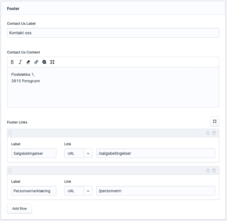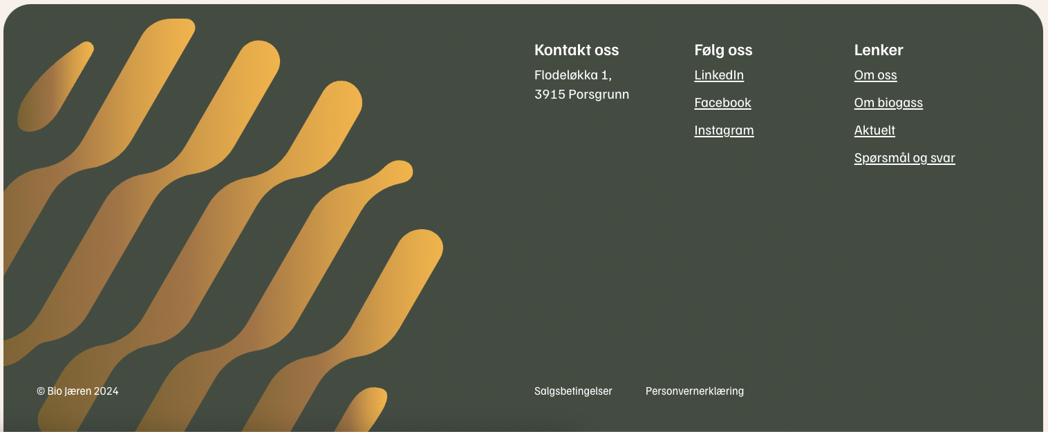 Feltene man kan fylle ut her vises nederst på nettsidene i footer, og hvis fylt ut som over så ser det slik ut: