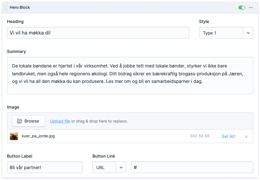 Her ser vi hvordan denne blokken er fylt ut i admin. Man velger en overskrift (heading), en innledning (summary) som kan inneholde generell tekst, bilde (image) og til slutt kan man legge til en tekst på knappen (button label) og velge hvor knappen skal linke (button link).