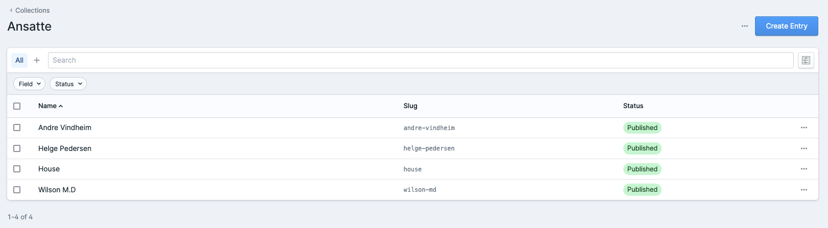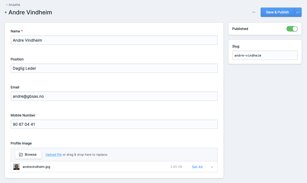 Ansatte er hvor man legger inn ansatte som skal vises fram. Det er sterkt anbefalt at man setter opp alle ansette hos Grenland Betongsaging her, siden alle skal blir vist I Employees (Ansatte) settet, brukt f.eks. på Kontakt Oss siden. Her er et eksempel på hvordan det kan se ut når man klikker på Collections > Ansatte i menyen: