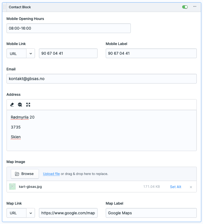 Contact Block (Kontakt Blokk) er en ganske ufleksibel blokk hovedsakelig laget for Kontakt Oss siden, vist her: