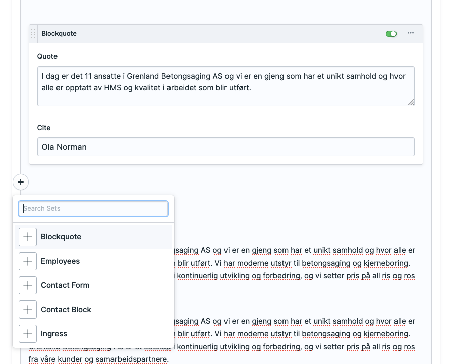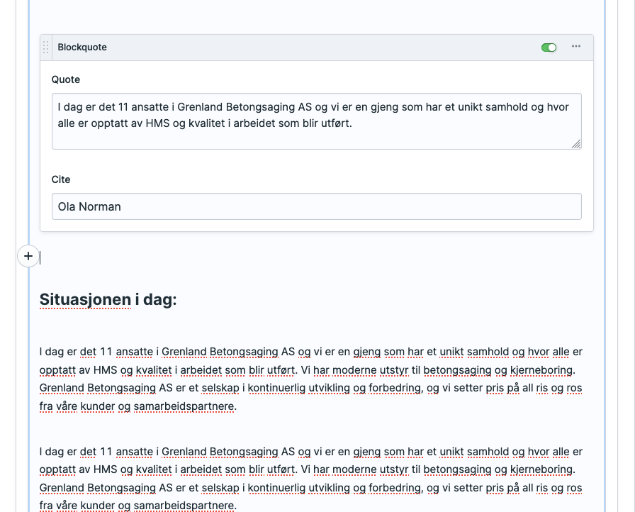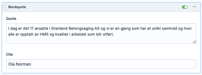 Blockquote er som regel standard I Statamic, men vi lagde en custom set fordi blockquoten trengte et spesifikt design.