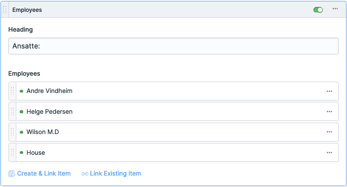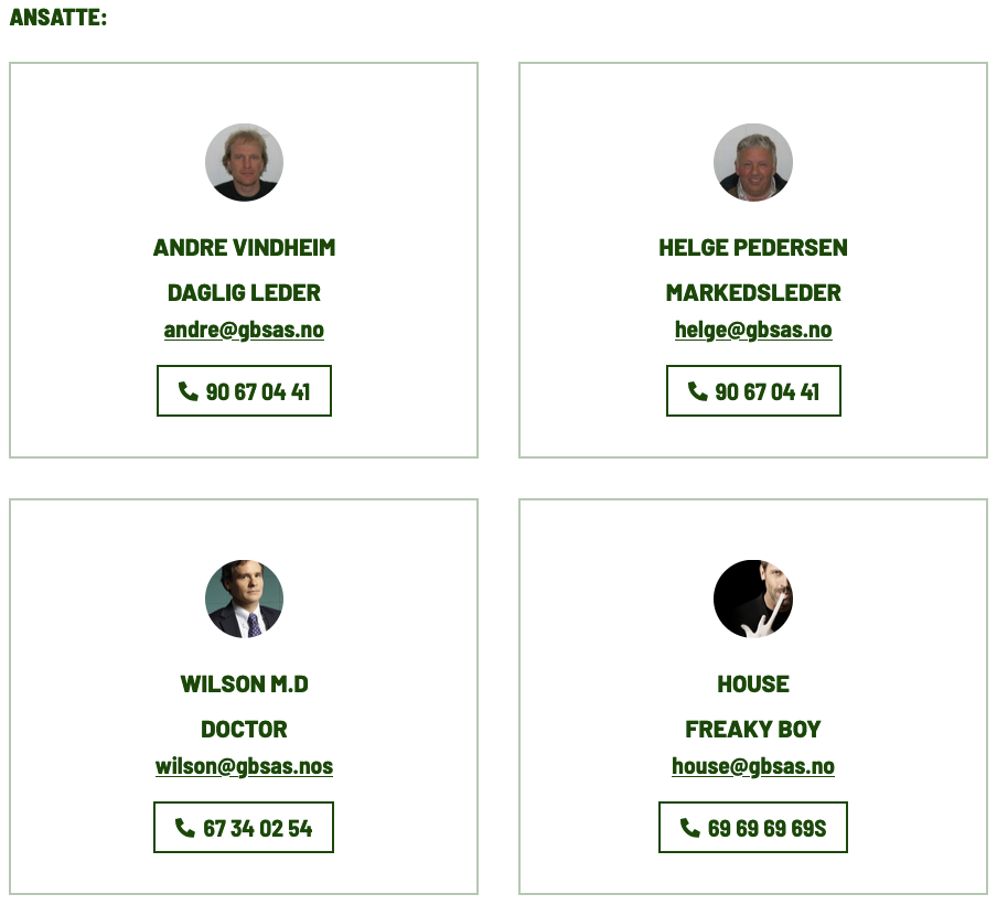 Employees (Ansatte) er et sett for å vise frem ansatte. Du kan I teorien velge hvilken ansatte du vil vise, men det er anbefalt å vise frem alle. Dette er hvordan Employees setten kan se ut, tatt fra Kontakt Oss: