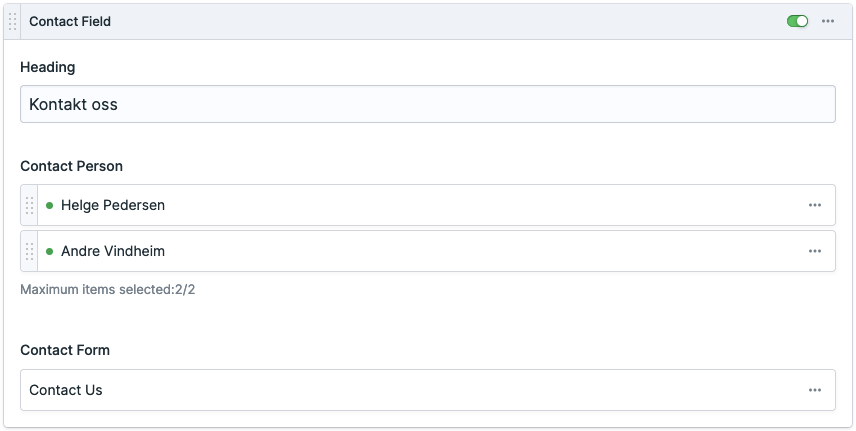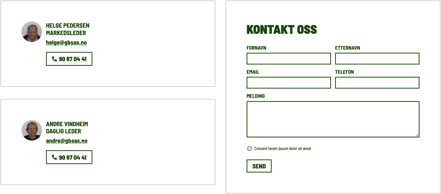 Contact Field (Kontaktfelt) er et felt som viser frem kontaktpersoner til Grenland Betongsaging og et Contact Form. Her er et eksempel på hvordan et Contact Field kan se ut, fra Prosjekter: