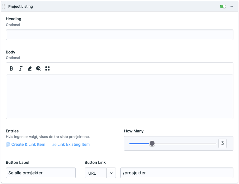 Her ser vi at Heading og Body ikke blir tatt I bruk. Det blir valgt 3 prosjekter, og fordi at det ikke ble valgt noen spesifikke, blir de nyeste prosjektene vist først. Så er det en link på bunnen som sender brukeren til prosjekter.