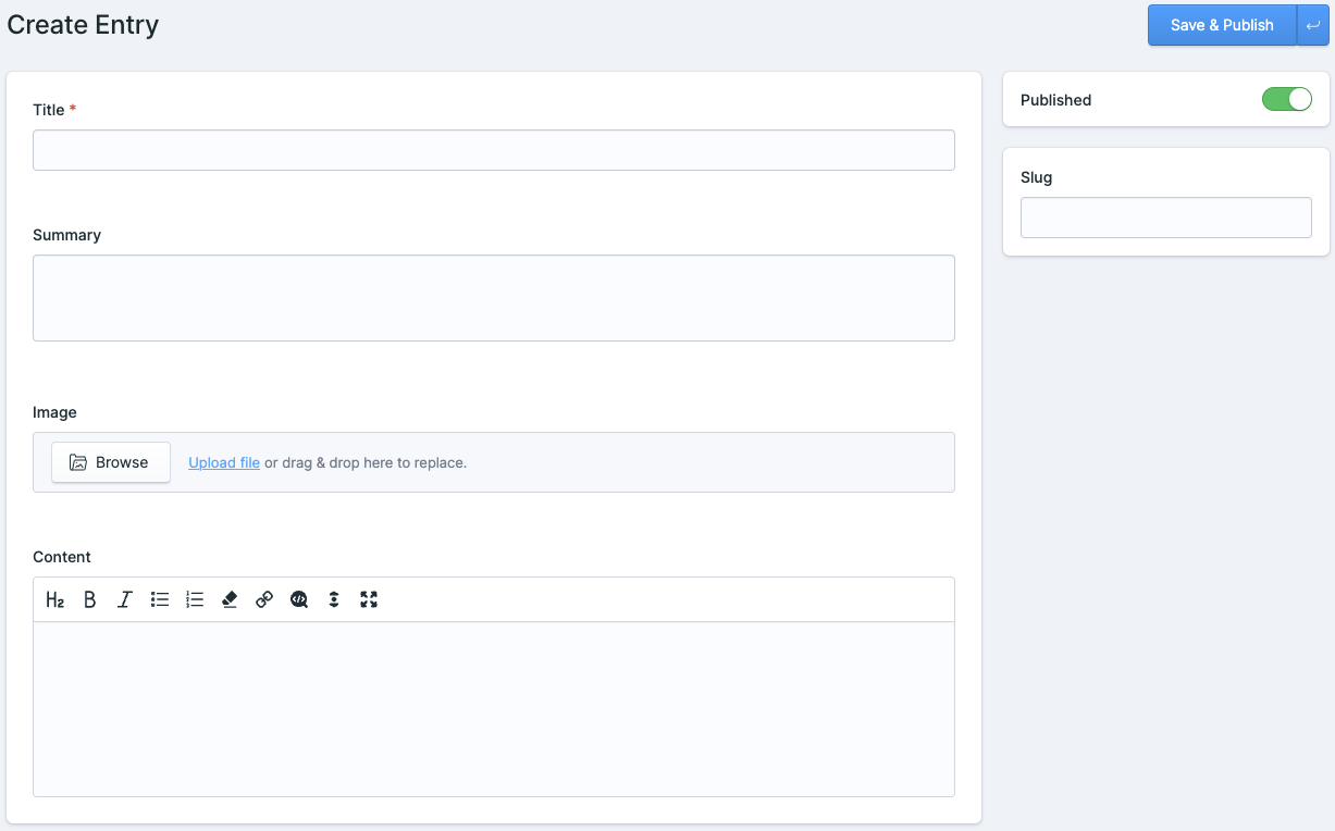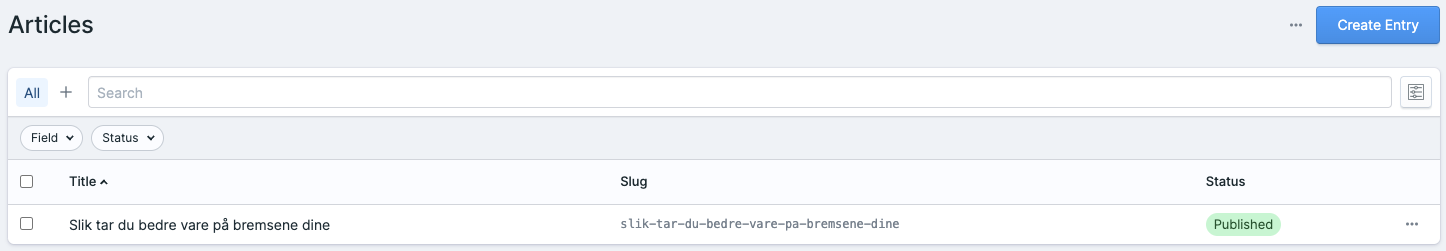 Når man skal opprette en ny artikkel klikker man på Create Entry øverst til høyre.