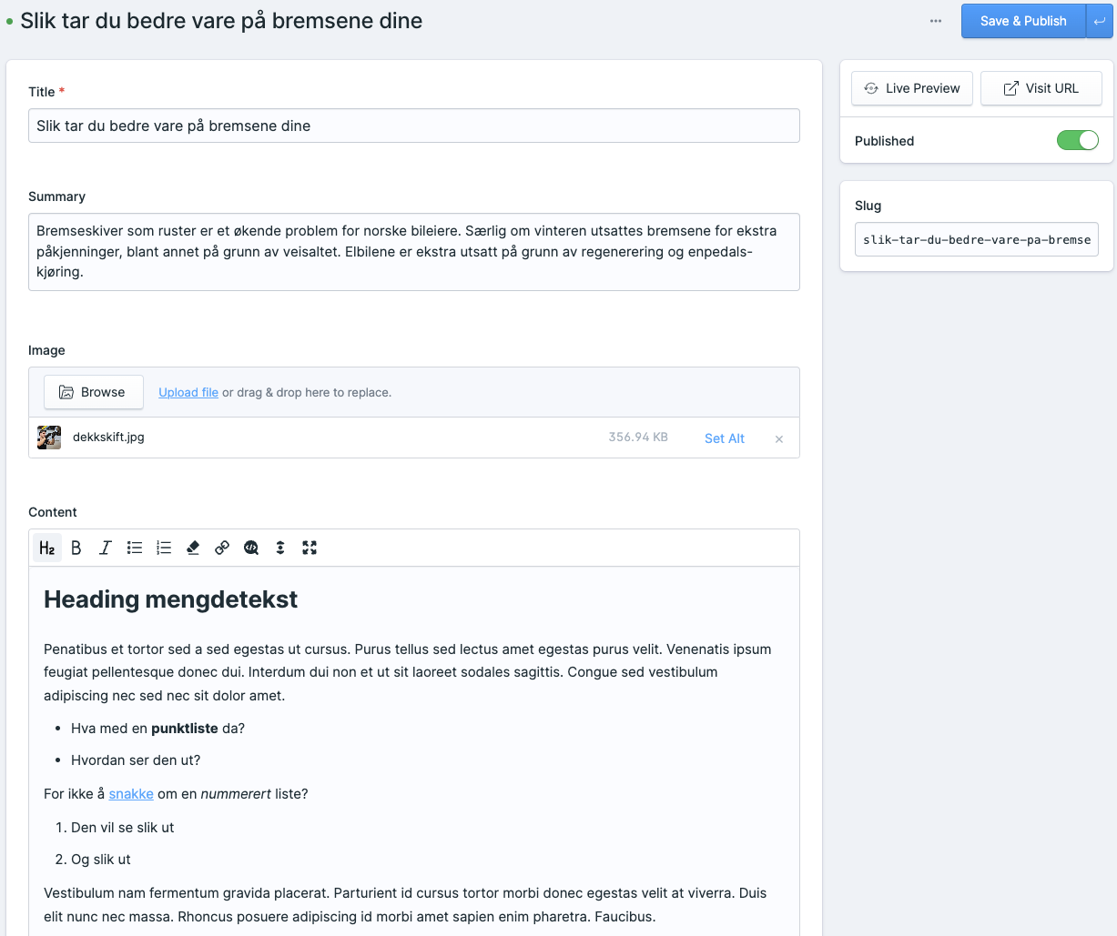 Videre så har man feltet Content og dette er et fleksibelt felt som kan inneholde formatert tekst, men også disse underelementene: