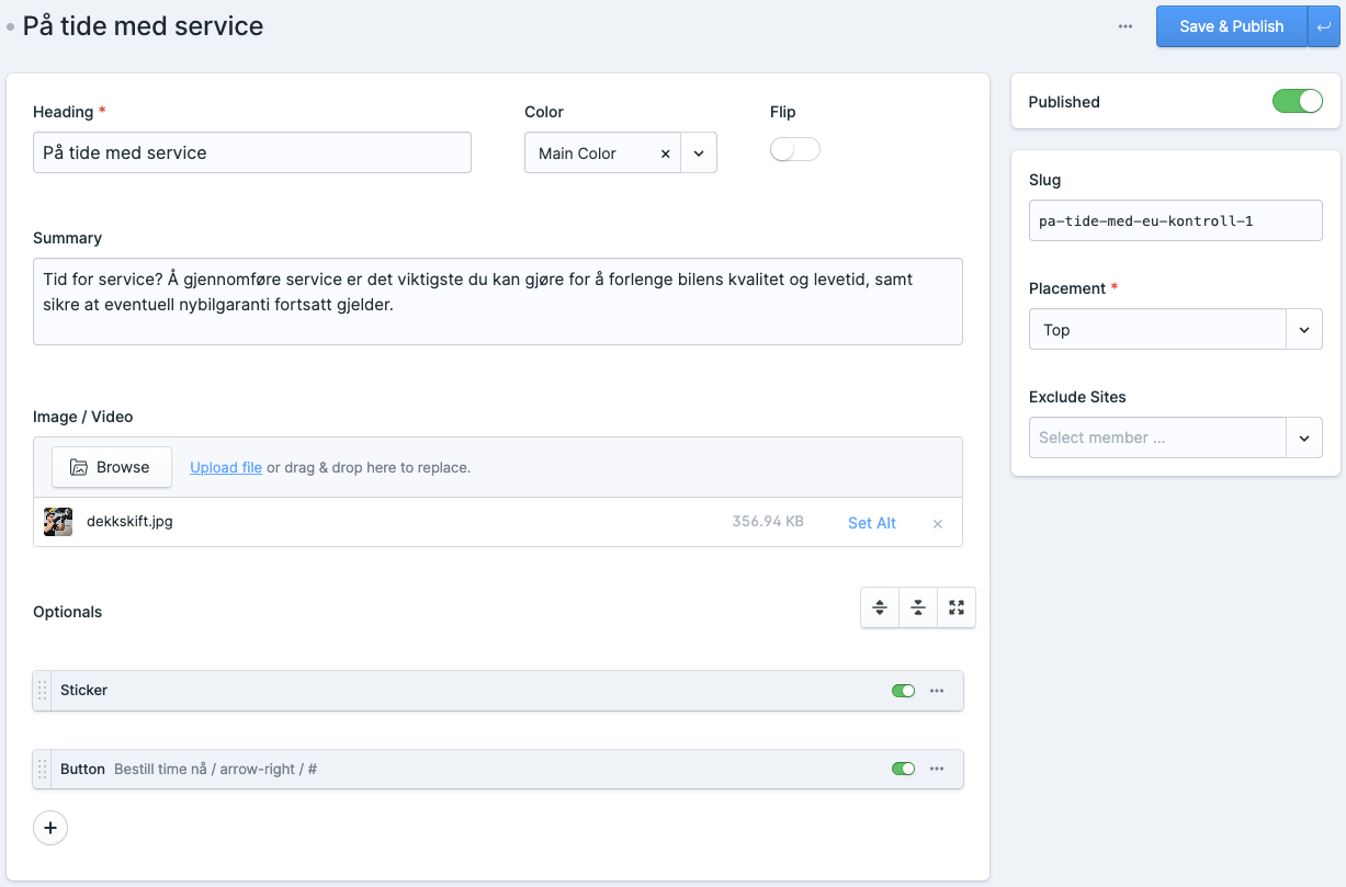 Kampanjer (campaigns) er området hvor man publiserer kampanjer for visning på alle medlemsbedrifters nettsider – enten de er på sjekkpunkt.no, eller har egne nettsider (i Sjekkpunkt-regi). Her er et eksempel på hvordan det kan se ut når man klikker på Collections > Campaigns i menyen:
