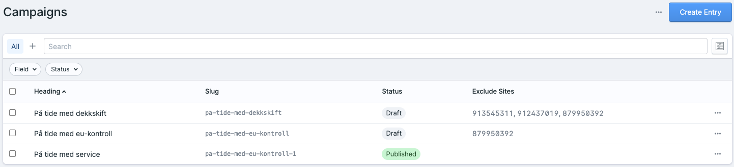 Når man skal opprette en ny kampanje klikker man på Create Entry øverst til høyre.