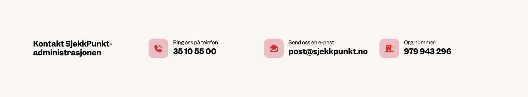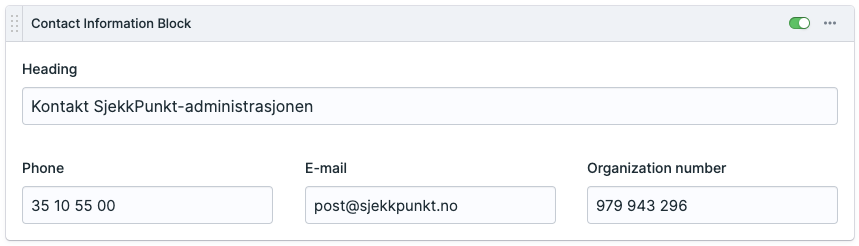 Denne blokken er først og fremst laget for å vise kontaktinformasjon til hovedkontoret til Sjekkpunkt. Samtidig er den fleksibel, så den kan brukes også til andre lokasjoner hvis ønskelig.