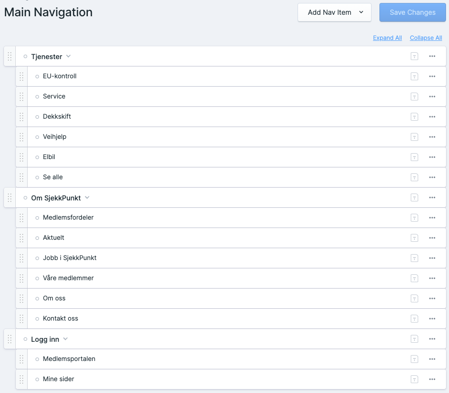 Main Navigation - Her er alle menypunktene som vises når man trykker på "Meny" oppe i venstre hjørne på desktop, eller nederst på mobiltelefon.