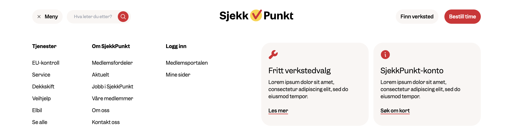 Service - I navigasjonen på desktop så er det en egen meny for Tjenester, og her velger man hvilke menypunkter som skal vises i den.