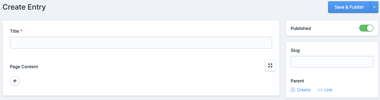 Da kommer man inn til en blank side, og man kan fylle inn en tittel, og deretter legge til innholdselementer ved å trykke på +-ikonet under Page Content. En liste med tilgjengelige innholdselementer ser du til venstre her i dokumentasjonen.