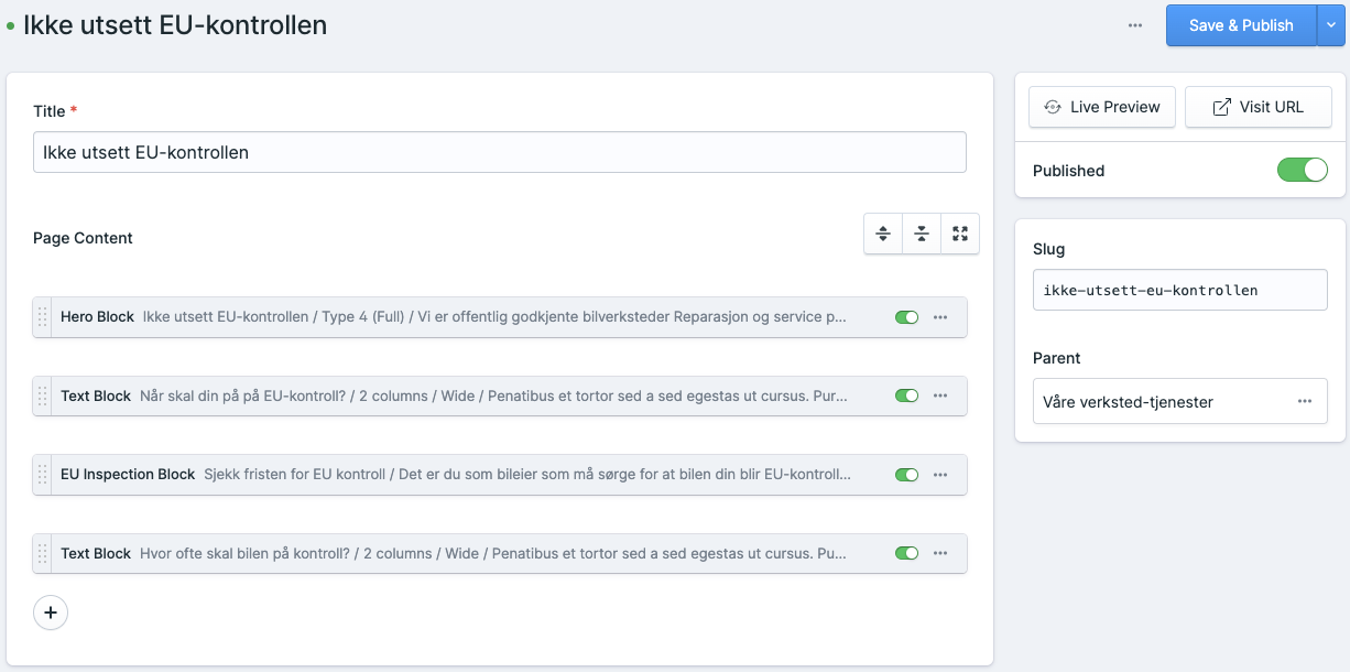 Forhåndsvisning (Live Preview) vil kun fungere etter at man har lagret en side – også som kladd (ved å slå av Published valget til høyre).