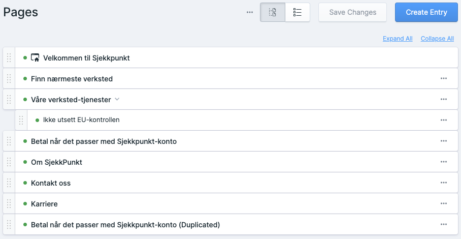 Trykke på de tre prikkene til høyre for en tittelen og velge Create Child Entry. Ved å gjøre dette så lager man en underside.